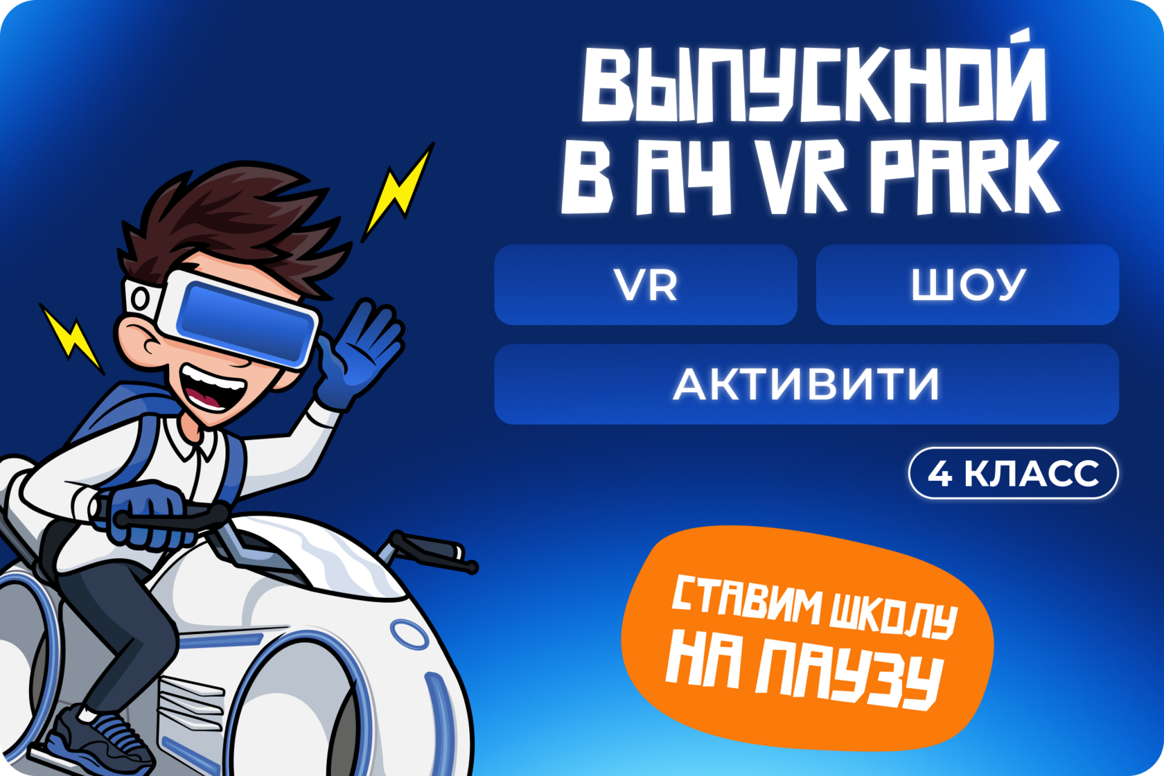 При бронировании выпускного в A4 VR PARK до 1 апреля стоимость за 1 человека 3700 рублей.